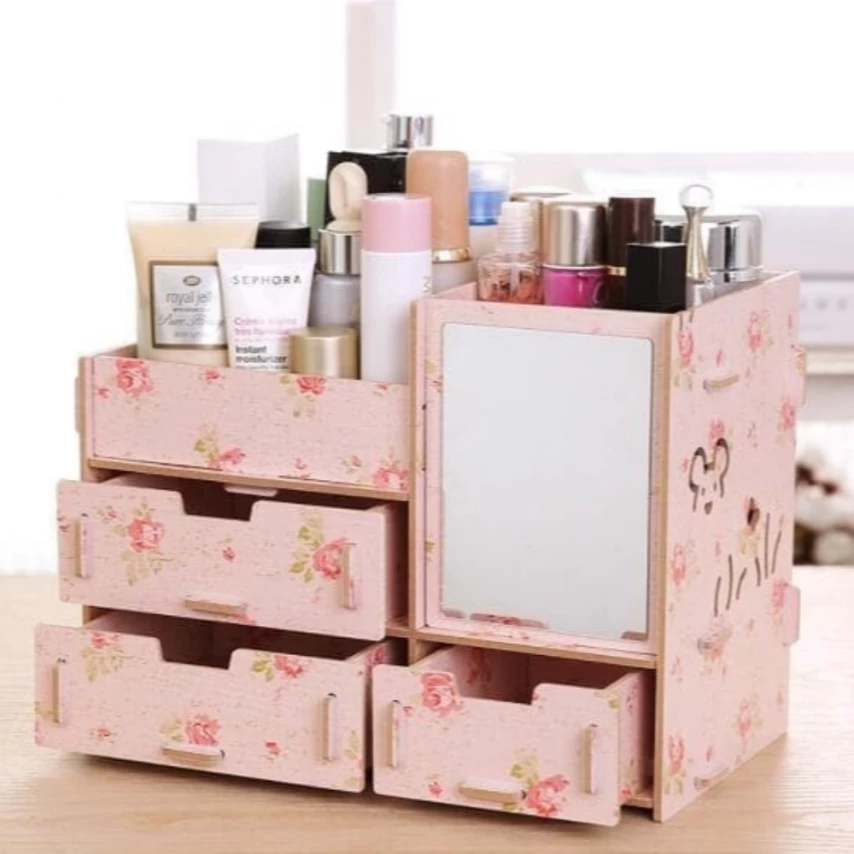 Rak kosmetik dari bahan kayu ringan. Ada lacinya dan memiliki banyak sekat serta dilengkapi cermin.